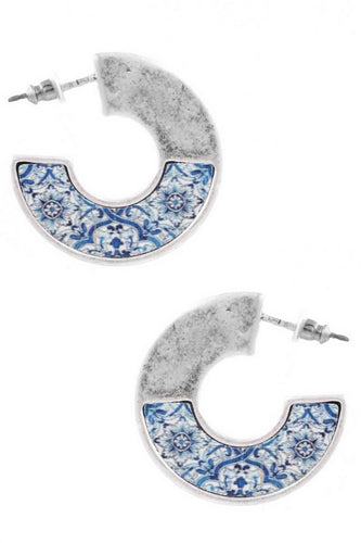Hammered Metal Wooden Print Open Hoop Earrings