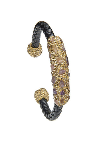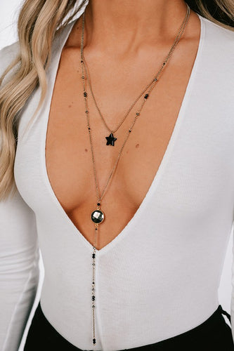 Black/Antique Gold Layered Lariat Necklace with Bead and Charm Detail